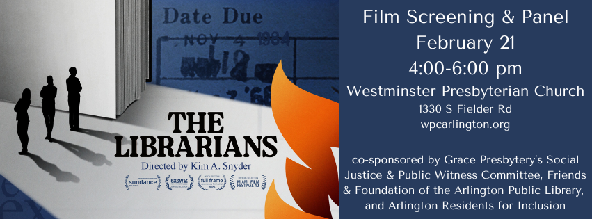 The Social Justice & Public Witness Committee of Grace Presbytery invites you to a special screening of “The Librarians,” an award-winning documentary about the freedom to read and the book bans - often done in the name of Christianity - that have seen a resurgence in public life. The Friends and Foundation of the Arlington Public Library will offer a panel after the documentary to speak to these issues locally.